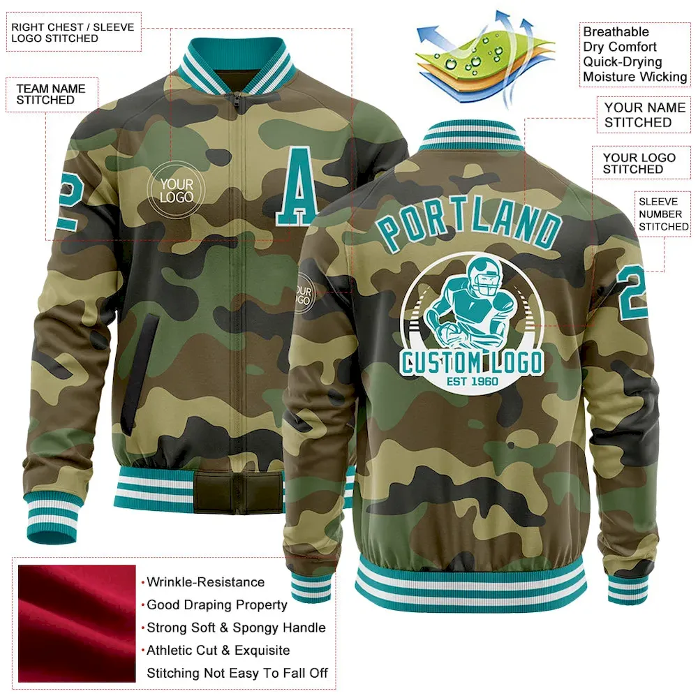Custom Camo Teal-White Bomber Varsity Letterman Salute To Service Zipper Jacket